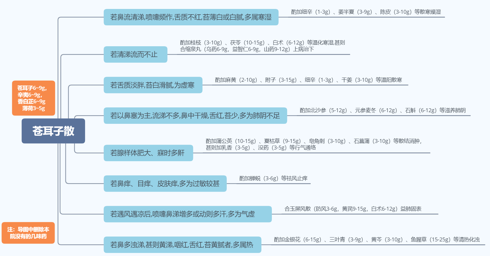 苍耳子散儿科常用剂量:炒苍耳子6~9g,辛夷6~9g,香白芷6~9g,薄荷3~5g现代用法:水煎,温服,每日2次。 盛老师临床常以本方加减,用于治疗小儿急慢性鼻炎、鼻窦炎、过敏性鼻炎、鼻源性咳嗽等病证,辨证属风邪上袭者。 疏风宣肺、通利鼻窍是治疗鼻渊的一大原则。因鼻源性疾病引起的慢性咳嗽,以苍耳子散为基础方,临证酌加桔梗、甘草宣肺升阳以利咽止咳,杏仁、浙贝母清肺降气以止咳化痰,共同组成苍耳子散加味方,临床取得了较好的疗效。 若鼻流清涕,喷嚏频作,舌质不红,苔薄白或白腻,多属寒湿,酌加北细辛、姜半夏、陈皮等散寒燥湿;若清涕流而不止,酌加桂枝茯苓、白术等温化寒湿,甚则合缩泉丸上病治下;若舌质淡胖,苔白滑腻,为虚寒,酌加麻黄、附子、细辛、干姜等温阳散寒;若遇风遇凉后,喷嚏鼻涕增多或动则多汗,多为气虚,合玉屏风散益肺固表;若鼻多浊涕,甚则黄涕,咽红,舌红,苔黄腻者,多属热,酌加金银花、三叶青、黄芩、鱼腥草等清热化浊;若以鼻塞为主,流涕不多,鼻中干燥,舌红,苔少,多为肺阴不足,酌加北沙参、元参麦冬、石斛等滋养肺阴;若鼻痒、目痒、皮肤痒,多为过敏较甚,酌加蝉蜕、蜂房、白蒺藜等祛风止痒;若腺样体肥大、寐时多鼾,酌加蒲公英、夏枯草、皂角刺、石菖蒲等散结消肿,甚则加乳香、没药、炮山甲等行气通络。