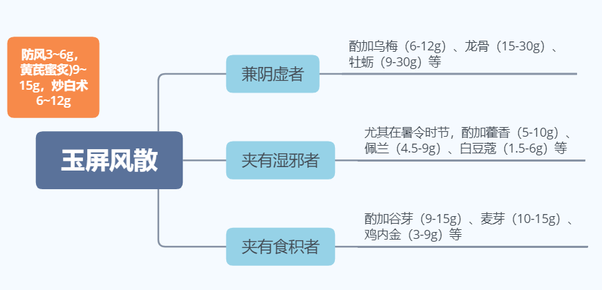 玉屏风散以黄芪为君药,甘温益气,固表止汗;白术为臣药,健脾益气,固表止汗;芪、术合用,大补脾肺之气,脾胃健旺,肌表充实,则汗不易泄,邪不易侵。防风佐药,走表以祛风邪。黄芪得防风,固表而不恋邪;防风得黄芪,祛邪不伤正。三药配伍,其效犹如御风之屏障,而又珍贵如玉,故名之曰“玉屏风散”。