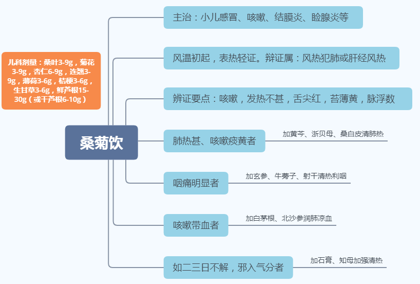 桑菊饮儿科常用剂量:桑叶3~9g,菊花3~9g,杏仁6~9g,连翘3~9g,薄荷3~6g,桔梗3~6g,生甘草3~6g,鲜芦根15~30g(或干芦根6~10g)常 规水煎,不宜久煎,温服,每日2次。 盛老师临床常以桑菊饮加减,用于治疗小儿感冒、咳嗽、结膜炎、睑腺炎等病证,辨证属风热犯肺或肝经风热者。辨证要点为咳嗽,发热不甚,舌尖红,苔 薄黄,脉浮数。 肺热甚、咳嗽痰黄者,加黄芩、浙贝母、桑白皮清肺热;咽痛明显者,加玄参、牛蒡子、射干清热利咽;咳嗽带血丝者,加白茅根、北沙参润肺凉血,如二三日不 解,邪入气分者,加石膏、知母加强清热。