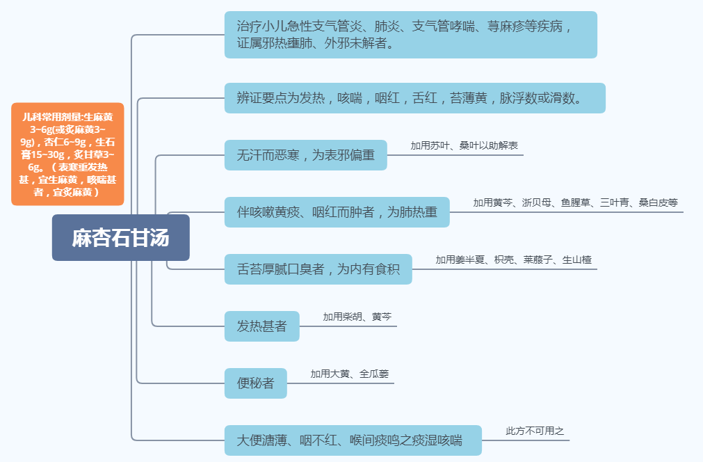 麻黄杏仁甘草石膏汤儿科常用剂量:生麻黄3~6g(或炙麻黄3~9g),杏仁6~9g,生石膏15~30g,炙甘草3~6g表寒重发热甚,宜生麻黄,咳喘甚者,宜炙麻黄。常规水煎,温服,每日2次。 盛老师临床常以麻黄杏仁甘草石膏汤为基础方加减,用于治疗小儿急性支气管炎、肺炎、支气管哮喘、荨麻疹等疾病,证属邪热壅肺、外邪未解者。其辨证要点为发热,咳喘,咽红,舌红,苔薄黄,脉浮数或滑数。 如无汗而恶寒,为表邪偏重,可加用苏叶、桑叶以助解表;伴咳嗽黄痰、咽红而肿者,为肺热重,可加用黄芩、浙贝母、鱼腥草、三叶青桑白皮等;舌苔厚腻口臭者,为内有食积,可加用姜半夏、枳壳莱菔子、生山楂;发热甚者,加用柴胡、黄芩;便秘者,可加用大黄、全瓜蒌。对于大便溏薄、咽不红、喉间痰鸣之痰湿咳喘,此方不可用之。
