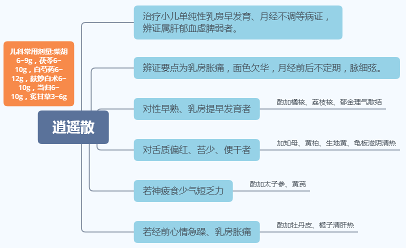 逍遥散儿科常用剂量:柴胡6~9g,茯苓6~10g,白芍药6~12g,麸炒白术6~10g,当归6~10g,炙甘草3~6g。现代用法:共为粗末,每服6~9g,煨姜、薄荷少许,共煎汤温服,每日3次。亦可作汤剂,水煎服,每日2次。亦有丸剂,每次6~9g,每日2次。 盛老师临床常以本方加减,用于治疗小儿单纯性乳房早发育、月经不调等病证,辨证属肝郁血虚脾弱者。辨证要点为乳房胀痛,面色欠华,月经前后不定期,脉细弦。 本方之特点乃既补肝体,又助肝用,气血兼顾,肝脾同治,使肝体得畅,血虚得养,脾虚得补,诸证自愈。 对性早熟、乳房提早发育者,可酌加橘核、荔枝核、郁金理气散结;对舌质偏红、苔少、便干者,酌加知母、黄柏、生地黄、龟板滋阴清热。若神疲食少气短乏力,可酌加太子参、黄芪;若经前心情急躁、乳房胀痛,可酌加牡丹皮、栀子清肝热。