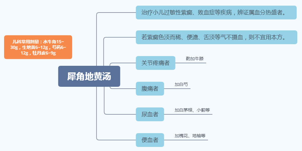 犀角地黄汤用于治疗小儿紫癜的主要病机是热入血分,迫血妄行而发斑,故紫癜鲜红,量多或斑片状。若量少,瘀呈暗红色不甚鲜,犀角(水牛角代)不用或少用。并注意酌加荆芥、防风、羌活、独活等祛风药,尤其对外邪入里引起者。若紫癜色淡而稀、便溏、舌淡等气不摄血,则不宜用本方。临床上合并关节疼痛者,可酌加牛膝;合并腹痛者,加白芍;合并尿血者,加白茅根、小蓟等;合并便血者,加槐花、地榆等。治疗期间应防止外感,卧床休息,限制活动。目前临床因抗生素的及时应用,小儿败血症多不会发展至血分热盛的阶段,如高热反复不退,伴皮疹色红、舌红绛者亦可予犀角地黄汤加减。