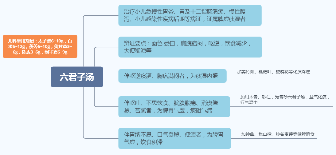 明汪昂《医方集解》;“此手足太阴、足阳明药也。人参甘温,大补元气,为君;白术苦温,燥脾补气,为臣;茯苓甘淡,渗湿泻热,为佐;甘草甘平,和中益土为使也。气足脾运,饮食倍进,则余脏受荫,而色泽身强矣。再加陈皮以理气散逆,半夏以燥湿除痰,名曰六君,以其皆中和之品,故曰君子也。”
