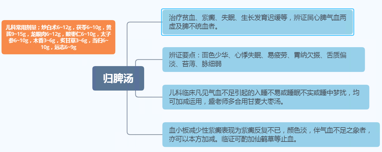 归脾汤治失眠以虚证为主,原方剂所载治思虑过度、劳伤心脾之失眠。儿科临床凡见气血不足引起的入睡不易或睡眠不实或睡中梦扰,均可加减运用,盛老师多合用甘麦大枣汤。