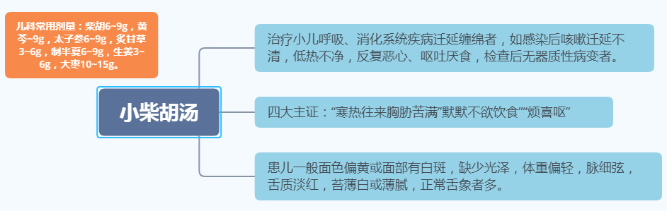 小柴胡汤是儿科临床运用很广的方剂,“寒热往来是其主证之一,其中的寒热可以是体温计测得的发热,更多的是患儿的自我感觉和家长观察到的,如孩子总叫“我热,我热”,入睡被子很薄仍然喊热,不愿盖,但一吹风或出门又怕冷,流清涕,接着就感冒了。这种寒既无附子可温之里寒,也无麻黄可汗之表寒;这种热既无石膏可清之经热,也无大黄可下之腑实。是谓寒热捉摸不定之象。“胸胁苦满”是小柴胡汤主证之二,提示疾病部位在胸胁,应包含肝、胆、胰、肺、胸膜、乳房等脏器;“苦满”是患儿自觉症状,年长儿会主诉胸闷,透不出气,难过,不会言语者则表现为烦躁哭吵。